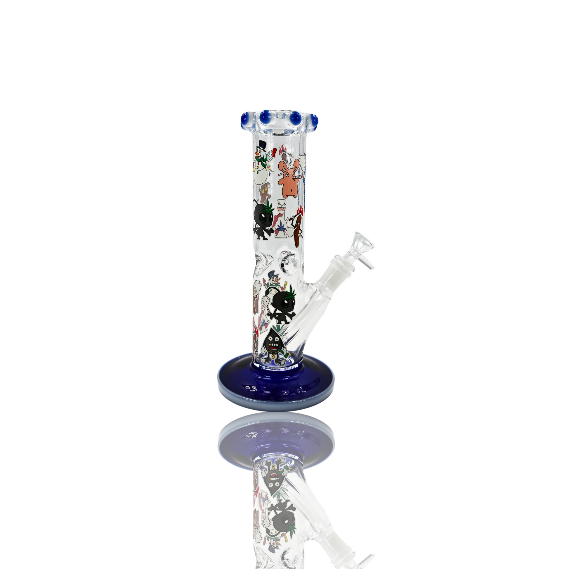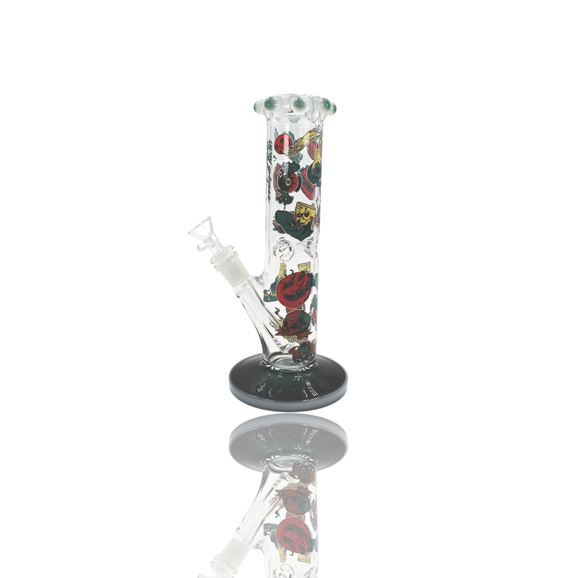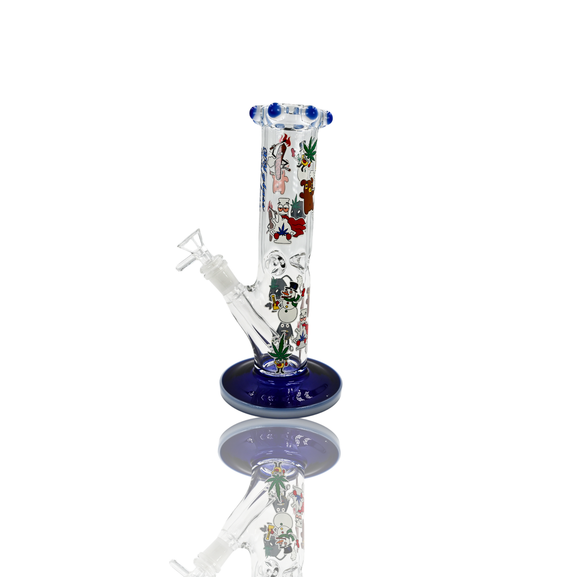 Little over 10 inch with wide diameter 7 mm tubing full color base with double color marbles on mouthpiece. Ice pinch with munchies and household characters glow in dark decal